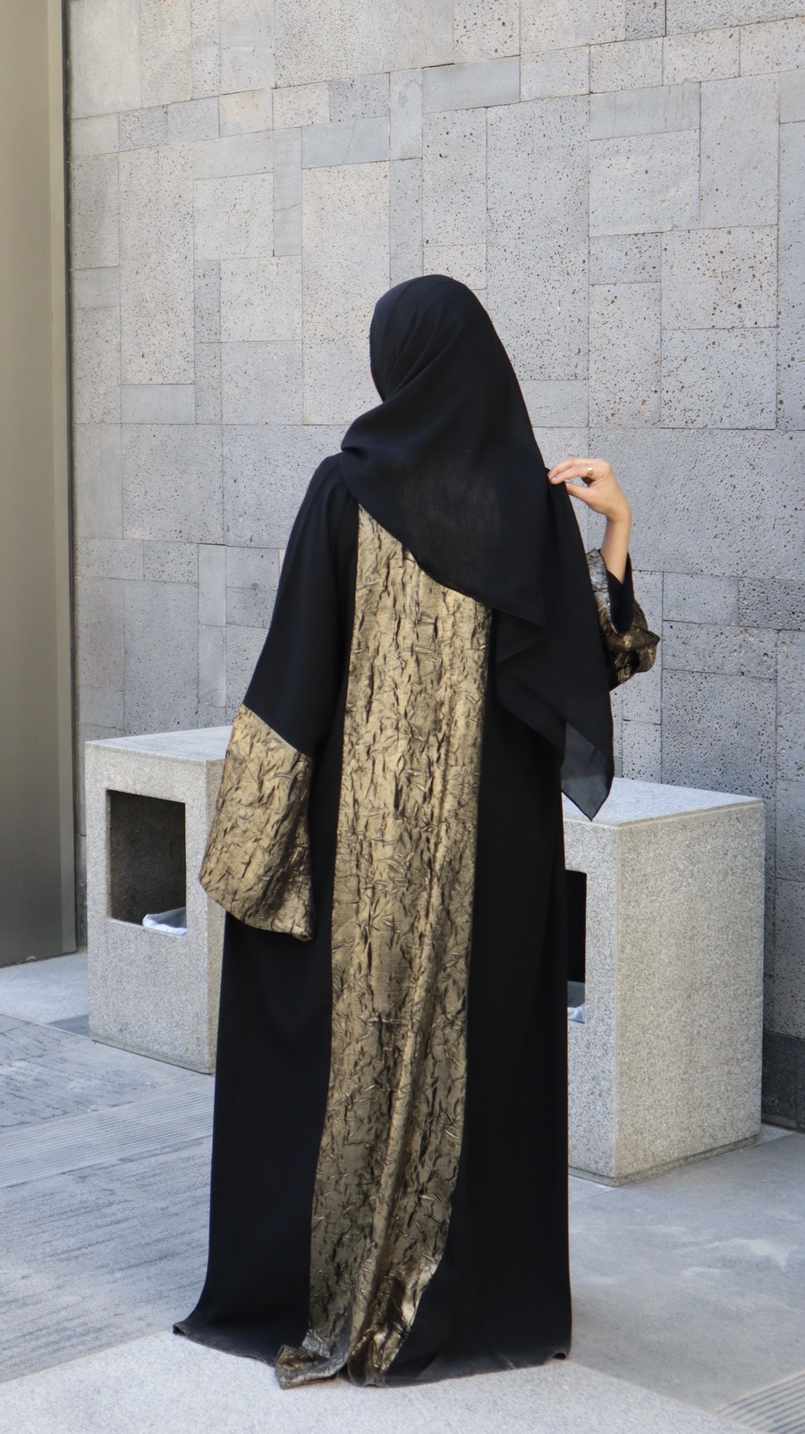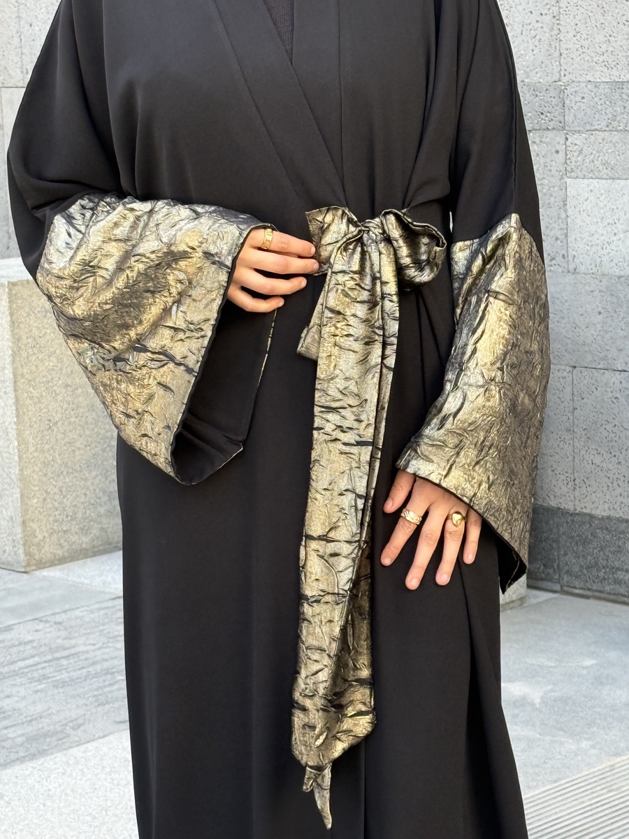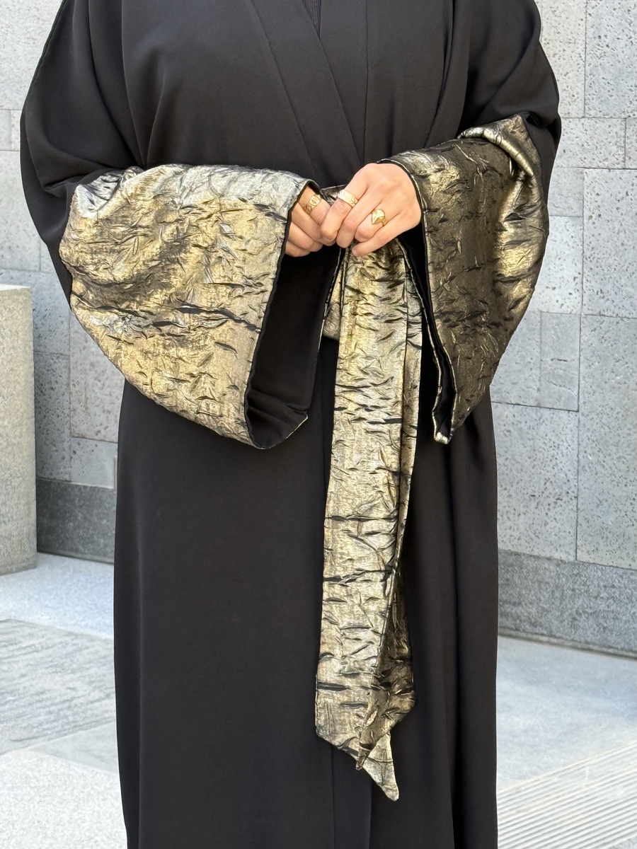 عباية مفتوحة (Open Abaya) بتصميم انسيابي واسع يديكي راحة كاملة وحرية في الحركة، وفي نفس الوقت يحافظ على الاحتشام العصري بأرقى صورة.